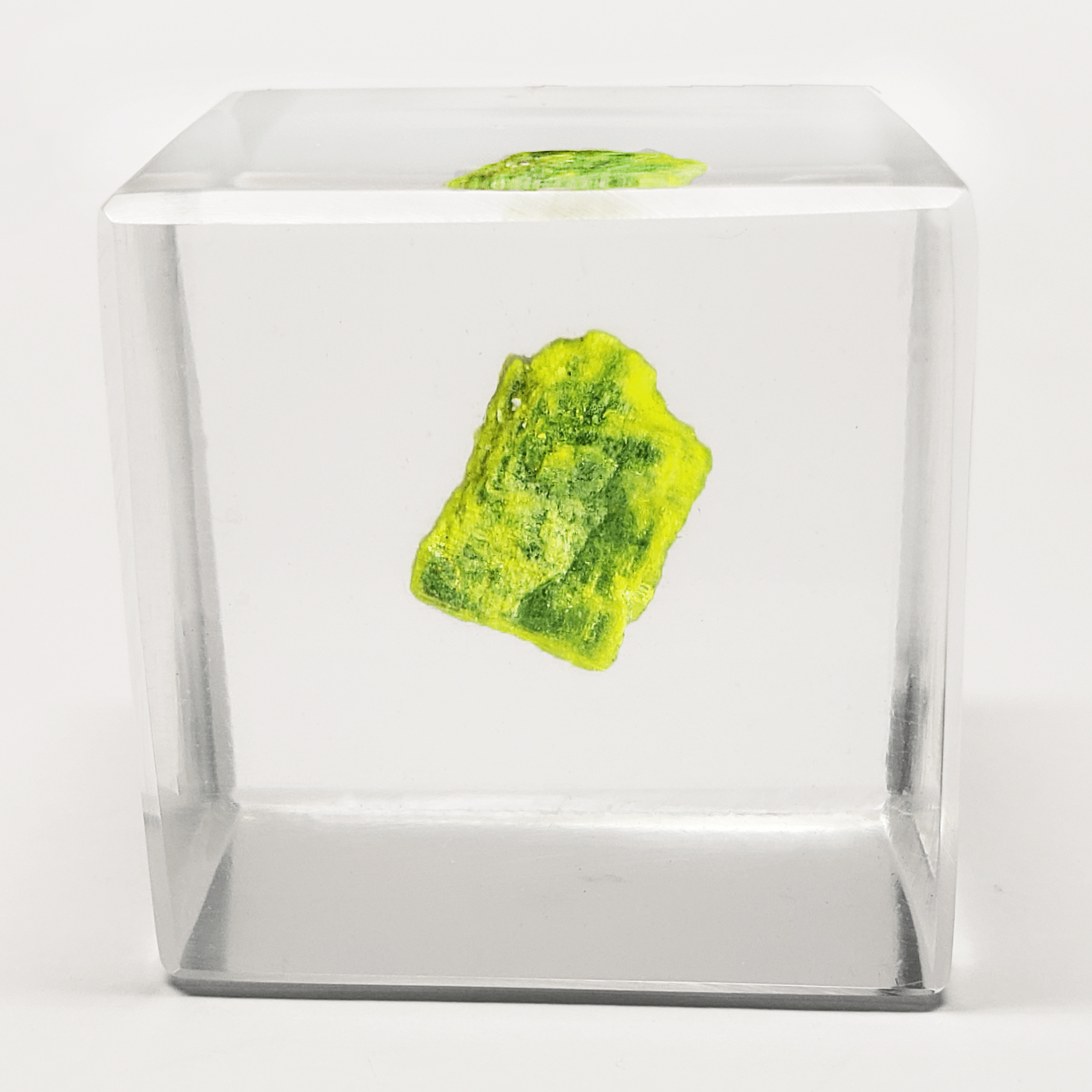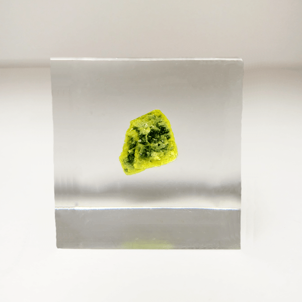 This 1 x 1 x 1-inch resin cube safely encapsulates a genuine crystal of autunite, which is 50 percent uranium by weight. When exposed to ultraviolet light, the crystal emits a stunning glow, making it a unique addition to any collection.